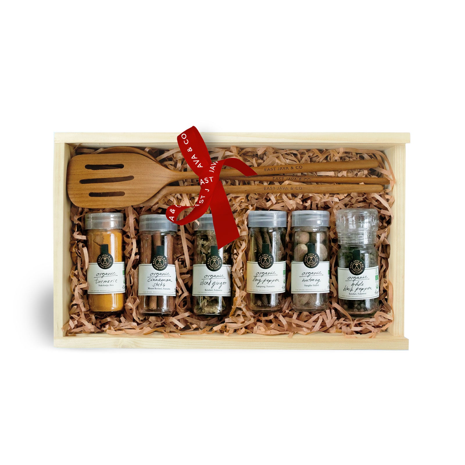 Six Organic Spices from across the Indonesian Archipelago and our Teak Cooking Spatula Set. Comes in a wooden box wrapped with our Signature Cotton Gift Wrap.