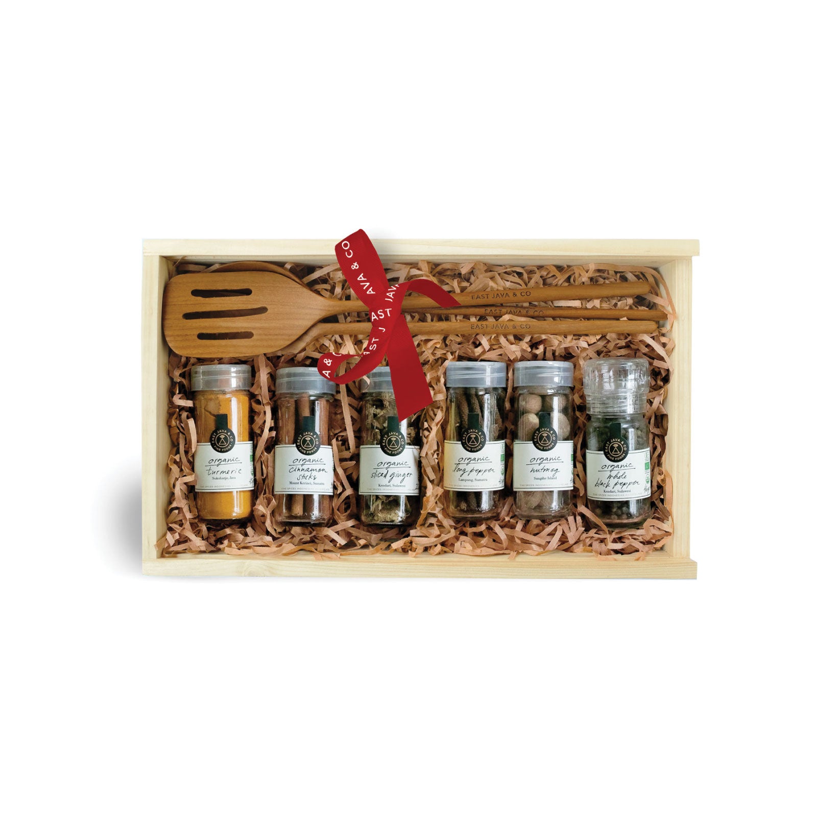 Six Organic Spices from across the Indonesian Archipelago and our Teak Cooking Spatula Set. Comes in a wooden box wrapped with our Signature Cotton Gift Wrap.