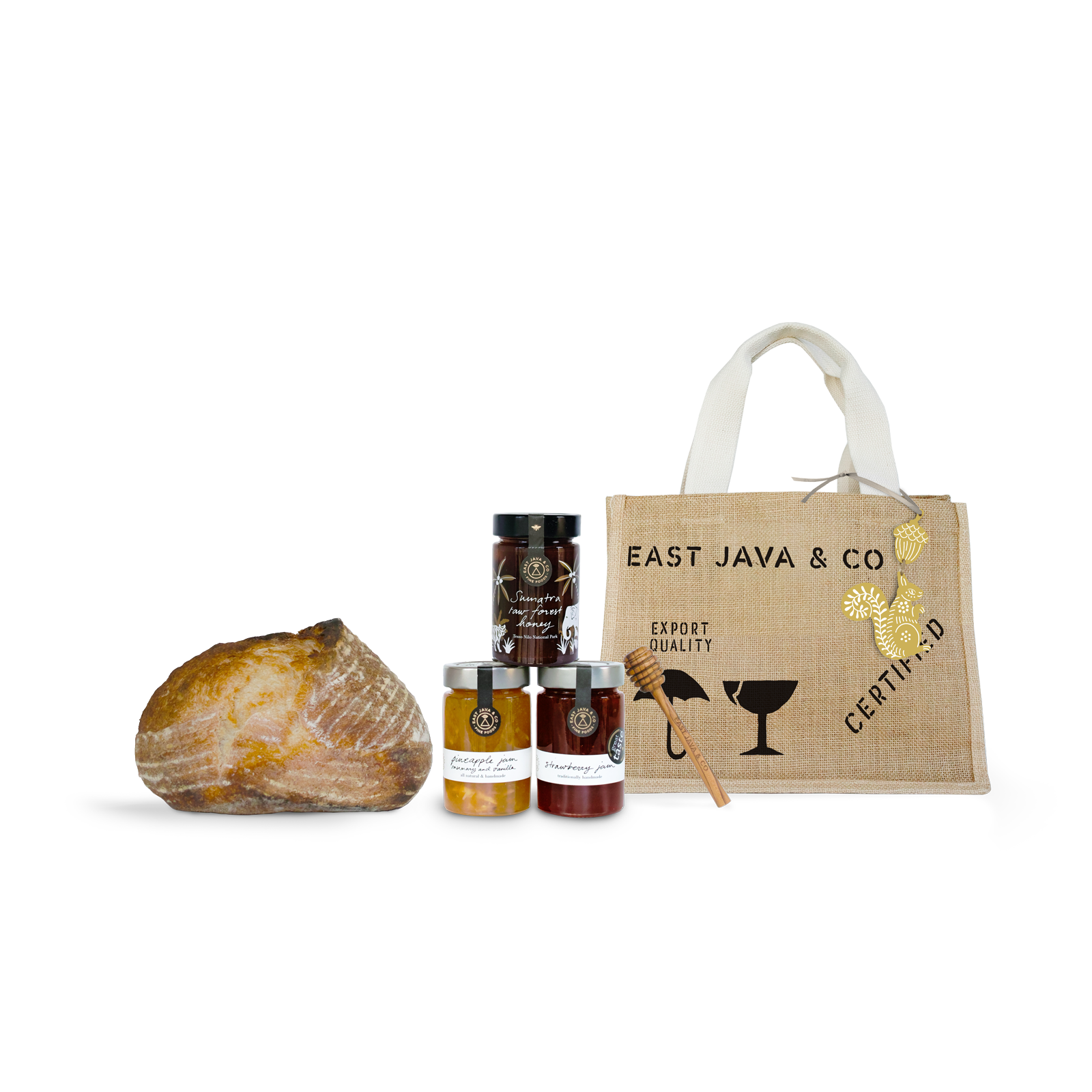 Our Country Sourdough Bread, two Fruit Jam 250g, Raw Forest Honey, East Java & Co Teak Honey Spoon and East Java & Co Jute Tote Bag (see more in the details tab)